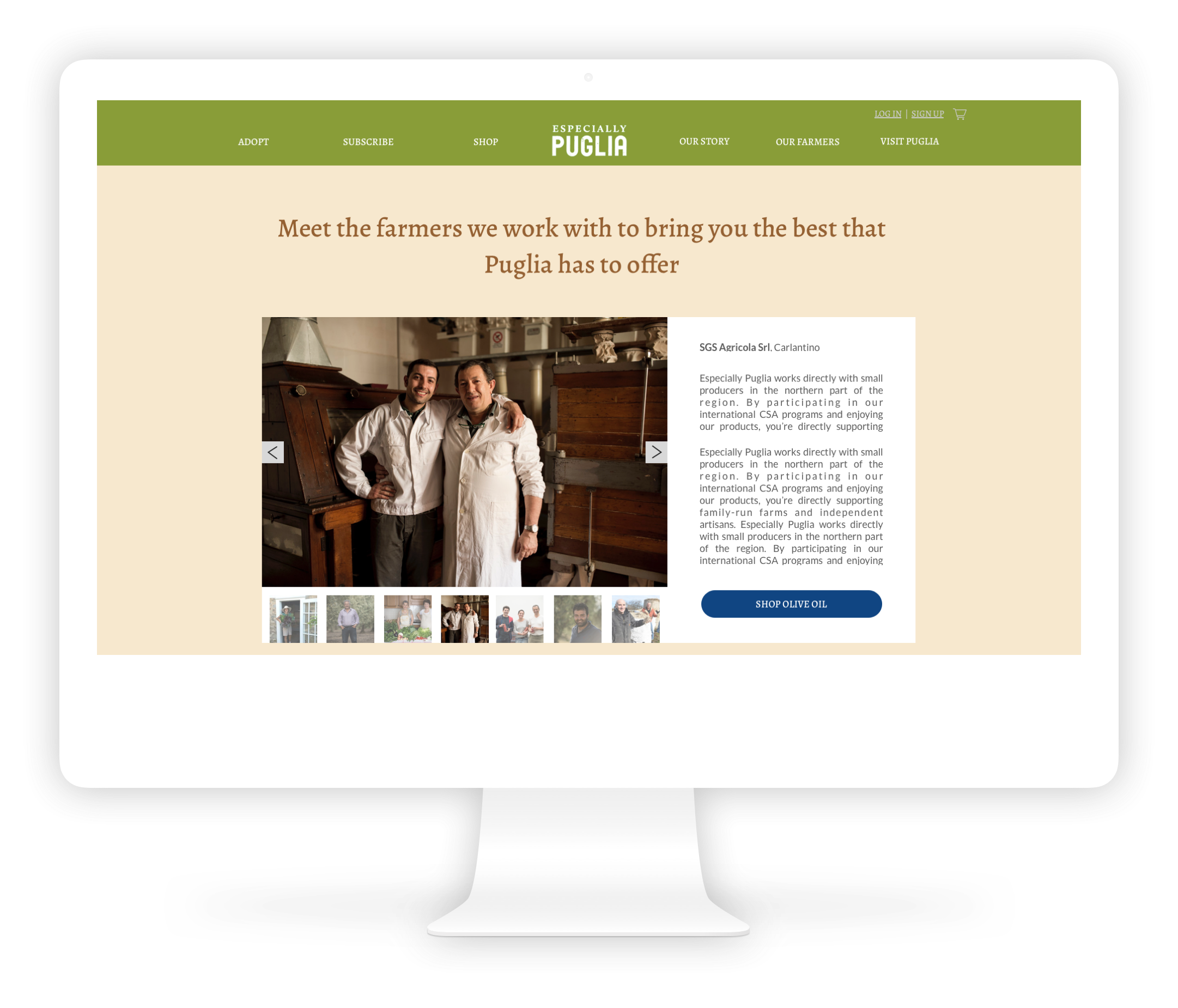 Given the time and physical constraints —— we had 2 weeks to complete the project and communicated with Michele remotely for all of it as he was in Puglia for an olive harvest (just small business things!) —— we redesigned the home page and the “Meet the Farmers“ page to spotlight exactly how customers would be directly supporting these family-owned farms. We also included some recommendations on branding/content strategy to build customers’ connection with Especially Puglia throughout their journey.